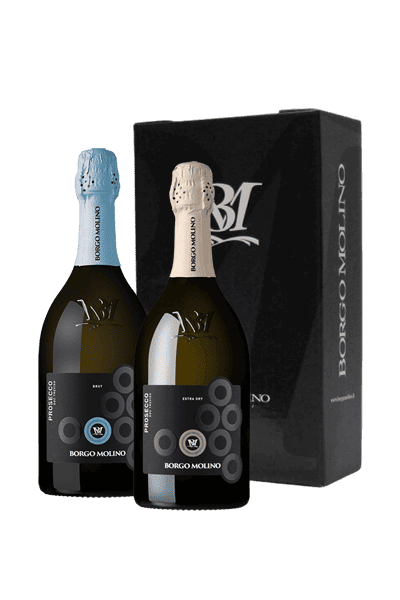 Két prémium prosecco különlegesség a Borgo Molino pincészettől egy elegáns saját márkás díszdobozban. A csomagban szereplő prosecco-k Treviso városka ültetvényeiről származnak, az egyik egy extra dry, a másik pedig egy brut kategória. Tökéletes aperitifek, vendégségbe, ajándékba, vagy az ünnepi menühöz halak, tenger gyümölcsei mellé.